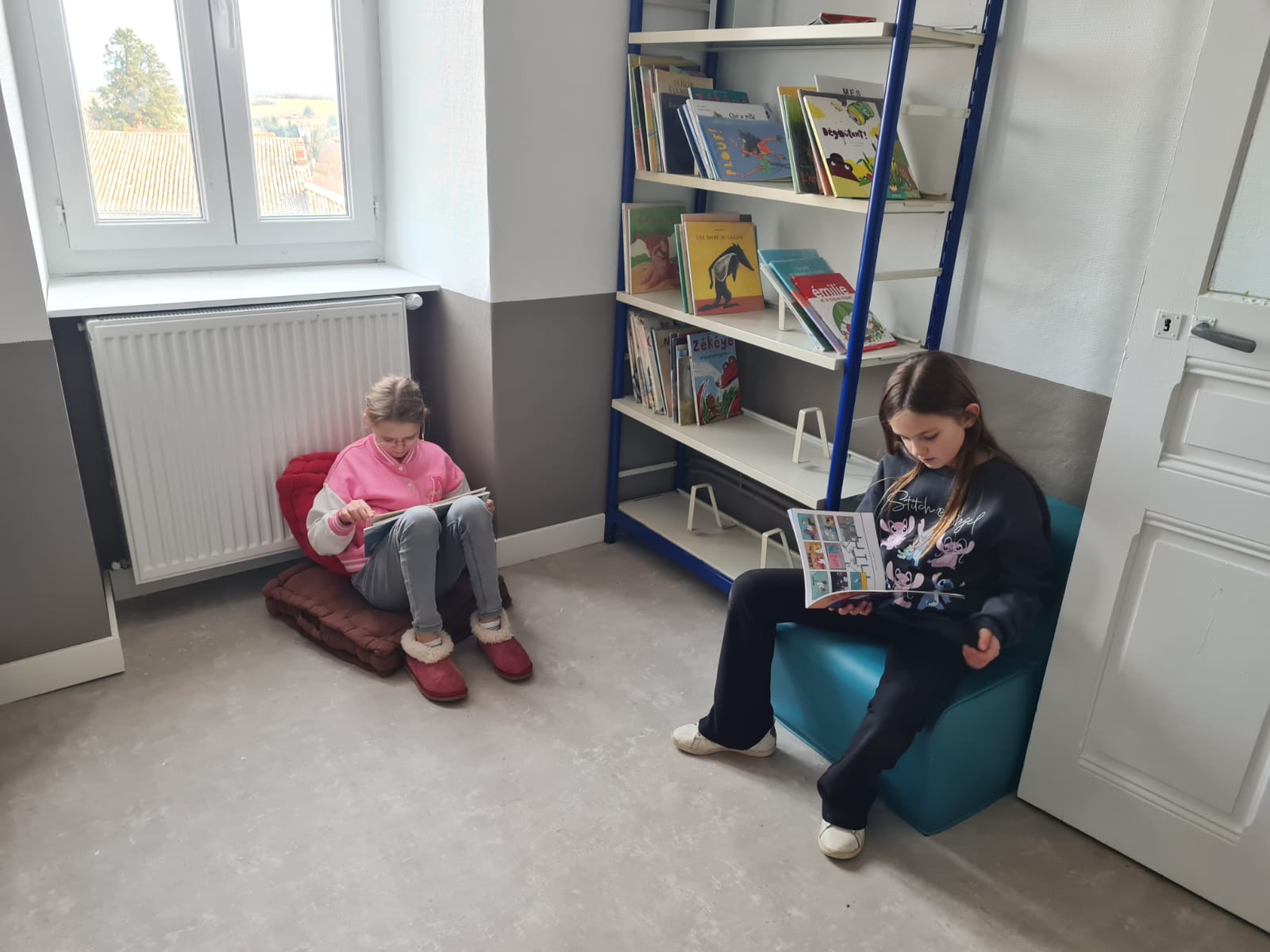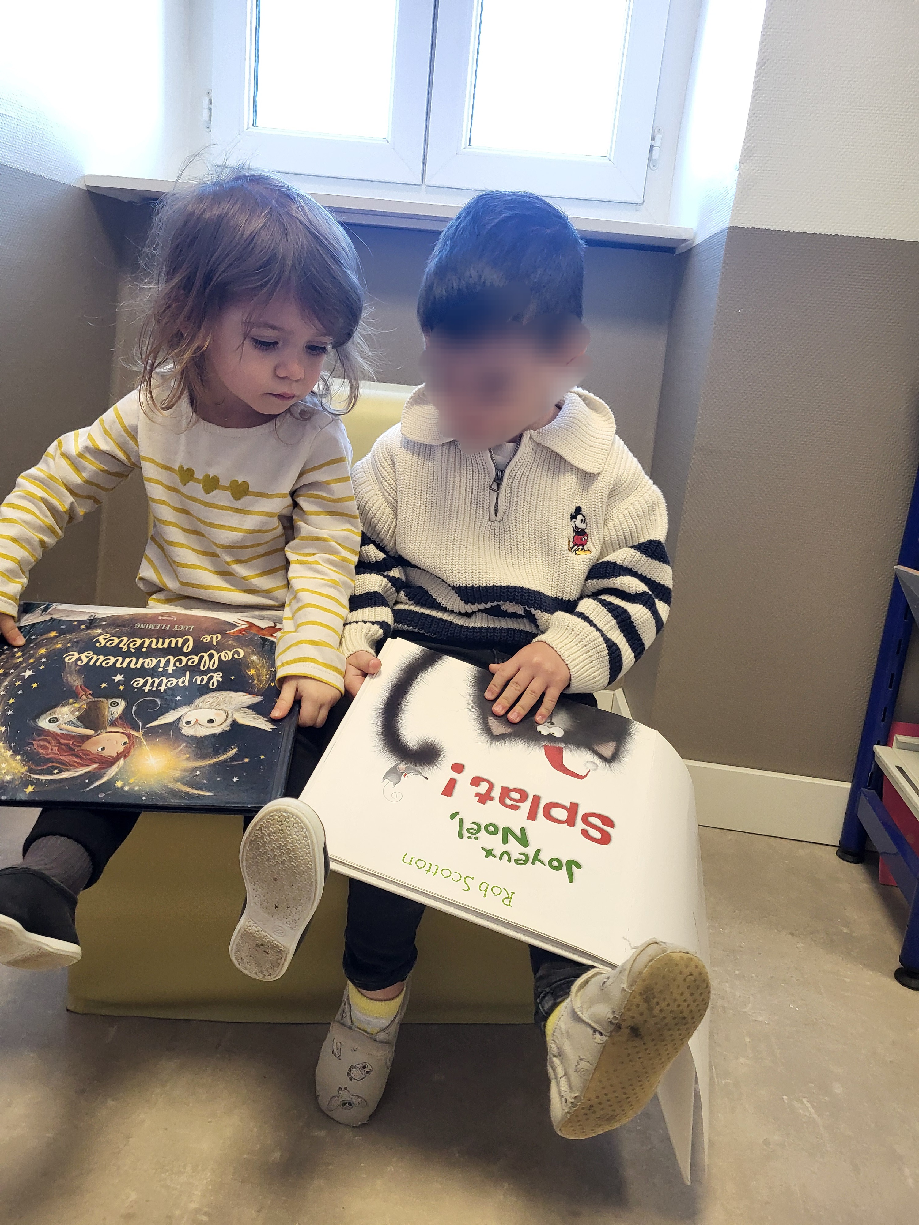 À l’occasion de Noël, l’Apel a souhaité compléter ce projet en offrant du nouveau mobilier pour la bibliothèque : deux chauffeuses et une banquette, créant ainsi des espaces confortables où les enfants peuvent lire, écouter des histoires ou travailler autrement, dans une ambiance conviviale.