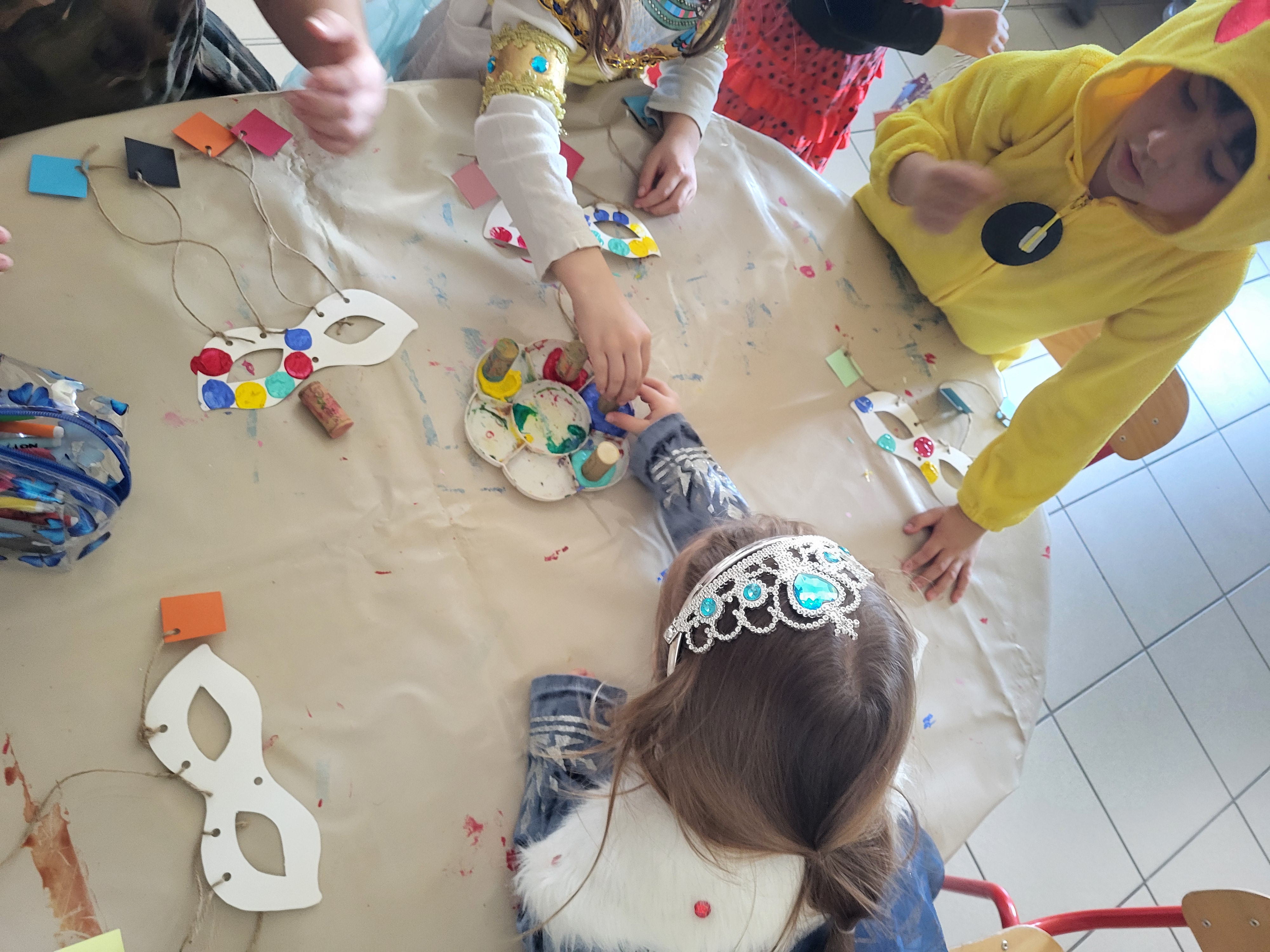 🎨 Atelier créatif : réalisation d’un magnifique mobile en forme de masque de carnaval. Peinture et couleurs ont donné naissance à de véritables œuvres d’art.