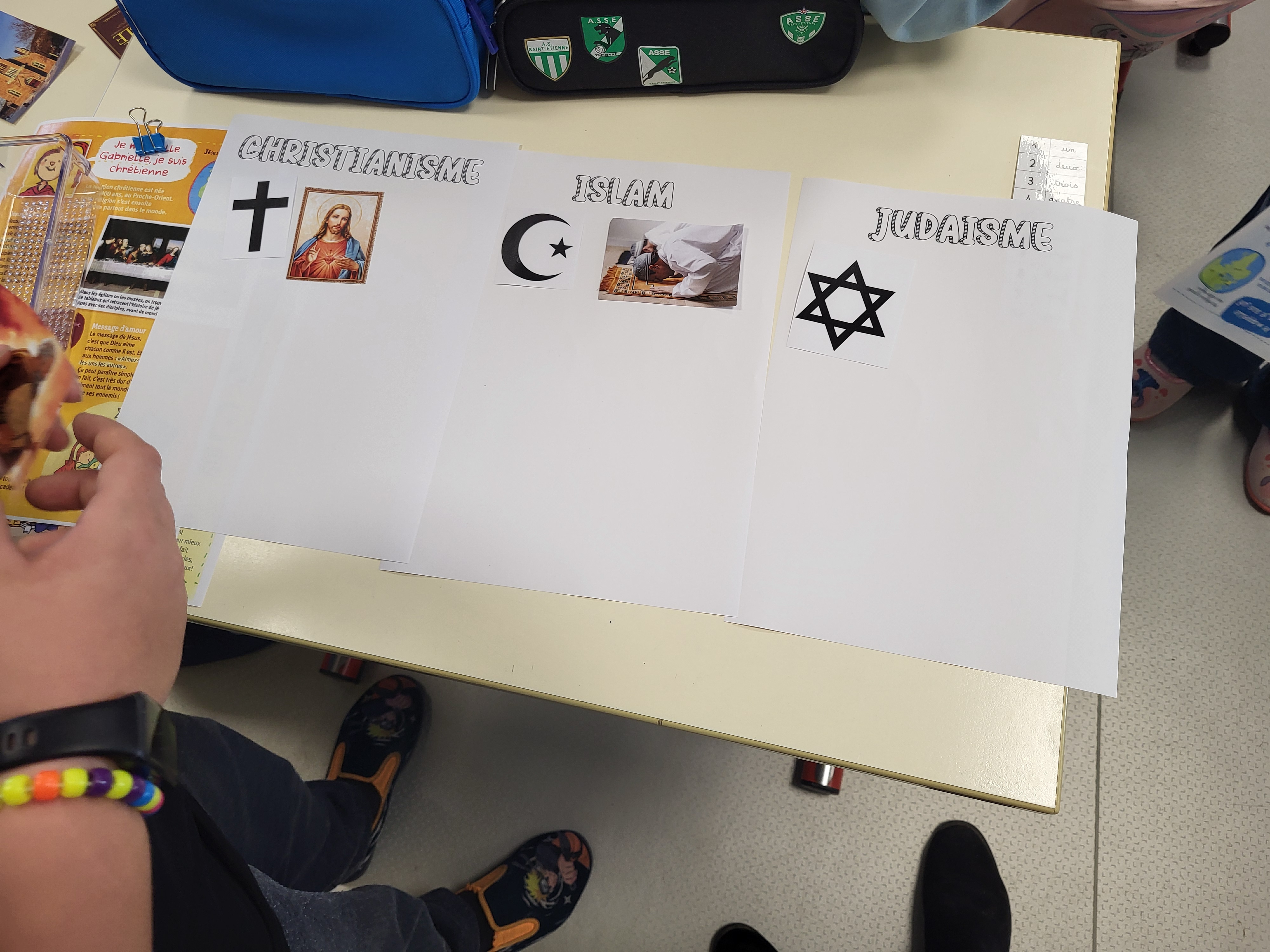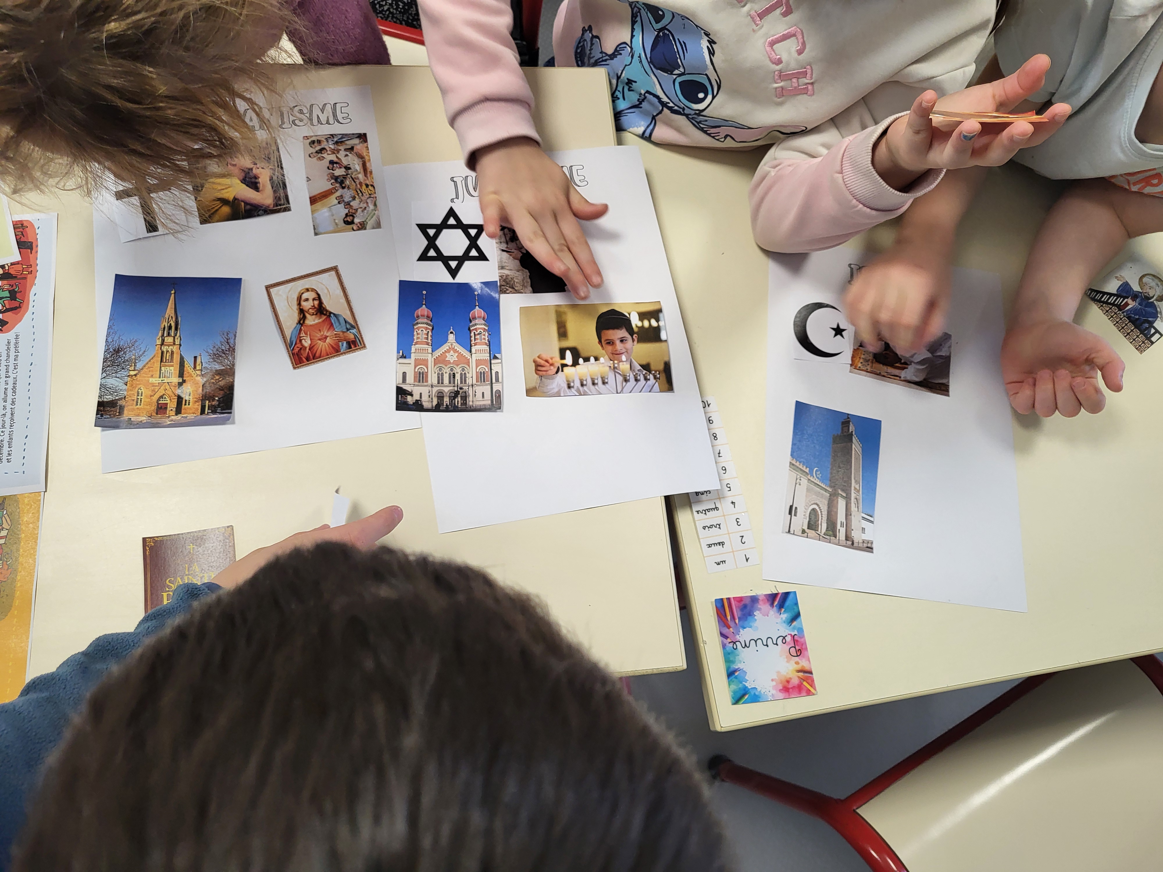1er temps de recherche, par groupe de 4 ou 5, les enfants trient des images en s’appuyant sur des lectures et leurs connaissances personnelles. Tout n’est peut-être pas exact ce jour là mais les temps suivants leurs permettront d’étoffer leurs connaissances sur ces 3 religions.